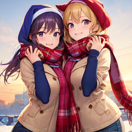 仲良く同じようなマフラーをして抱き合っている百合系女子達の絵